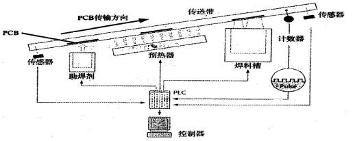 下面以雙波峰焊機(jī)的工藝流程為例,來(lái)說明波峰焊原理(見圖3-1)。