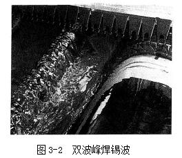 印制板繼續(xù)向前運(yùn)行,印制板的底面首先通過第一個(gè)熔融的焊料波。第一個(gè)焊料波是亂波(振動(dòng)波或紊流波),將焊料打到印制板的底面所有的焊盤、元器件焊端和引腳上;熔融的焊料在經(jīng)過焊劑凈化的金屬表面上進(jìn)行浸潤(rùn)和擴(kuò)散。之后,印制板的底面通過第二個(gè)熔融的焊料波,第二個(gè)焊料波是平滑波,平滑波將引腳及焊端之間的連橋分開,并去除拉尖(冰柱)等焊接缺陷(圖3-2是雙波峰焊錫波)