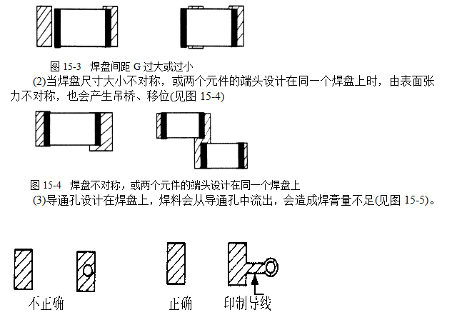 (2)焊盤間足L—確保元件端頭或引腳與焊盤哈當的搭接尺寸。焊盤間距過大或過小都會引起焊接缺陷;(見圖15—1)。