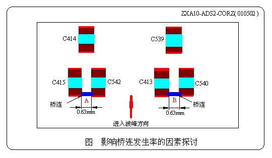 在上講中我們給出了一個(gè)討論題:C線在焊接工號(hào)為:ZXA10-ADS2-CORZ( 010502 )時(shí),基板上電容C415與C542、C413 與C540之間相鄰間隙均為0.63mm( <1.27mm,屬于設(shè)計(jì)不當(dāng)),用新噴嘴開(kāi)雙波時(shí)在圖2所示的A、B二處百分之百地發(fā)生橋連現(xiàn)象,而僅開(kāi)第二波進(jìn)行單波焊接時(shí),反而橋連發(fā)生率卻非常小。其實(shí)問(wèn)題就出在助焊劑上,主要原因不外乎是: