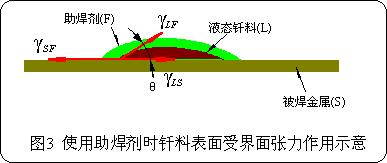 焊接中使用助焊劑可以清除釬料和被焊金屬表面的氧化膜,改善了潤(rùn)濕。而且當(dāng)液態(tài)釬料和被焊金屬表面復(fù)蓋了一層助焊劑之后,它們之間的界面張力發(fā)生了變化,如圖3所示。