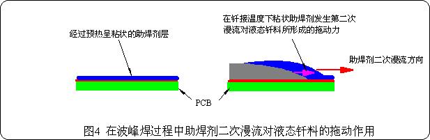 經(jīng)過(guò)預(yù)熱后的粘狀助焊劑與波峰釬料接觸后,活性劇增,粘度急劇下降而在被焊金屬表面形成第二次漫流,并迅速在被焊金屬表面鋪展開(kāi)來(lái)。助焊劑第二次漫流過(guò)程所形成的漫流作用力,附加在液態(tài)釬料上從拖動(dòng)了液態(tài)金屬的漫流過(guò)程,如圖4所示。