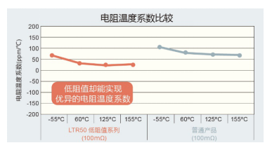 一般情況下,電阻值越低,電阻溫度系數(shù)越大,但本系列產(chǎn)品通過優(yōu)化電阻體元件結構,實現(xiàn)了業(yè)界頂級的電阻溫度系數(shù)。例如,在100mΩ時LTR50系列實現(xiàn)了±100ppm/℃的電阻溫度系數(shù),可確保使用過程中具有穩(wěn)定的電阻值。