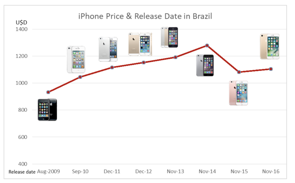 但是,富士康的出現(xiàn)并沒讓蘋果產品的價格下降。iPhone 6 發(fā)售時,在巴西的售價比美國售價高了 97%。甚至,連按時發(fā)售都做不到。巴西消費者見到 iPhone 4S 時,已經比全球發(fā)售時間推遲了至少兩個月。