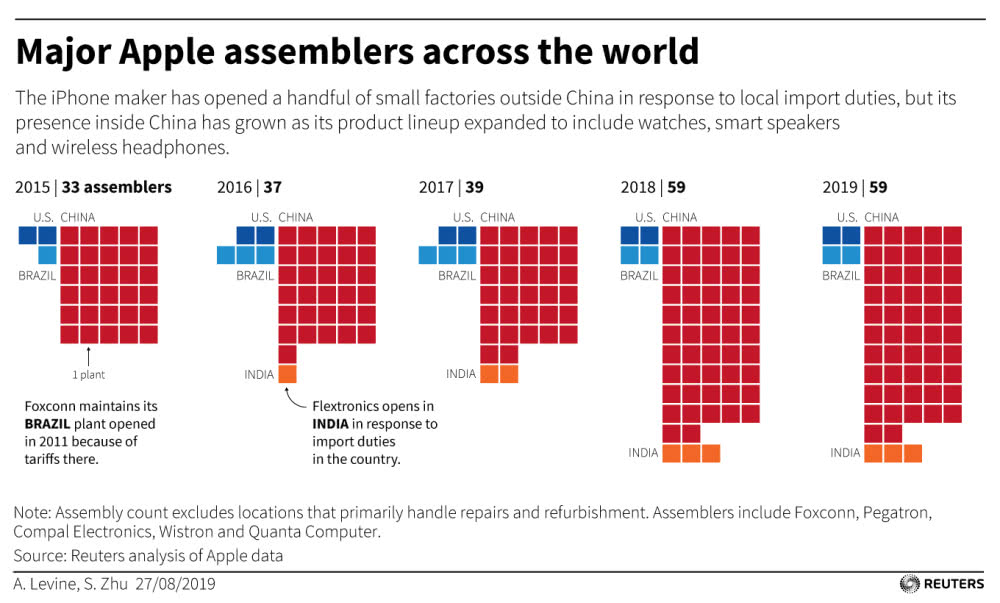 但是在這里產出的蘋果數(shù)量相比全球對蘋果的需求而言,只是杯水車薪。路透社 2019 年 8 月經過調查后發(fā)布的報告顯示,蘋果在印度和巴西兩國生產的產品只是用來滿足當?shù)匦枨?,而在中國增加的蘋果代工廠遠超過中國以外。